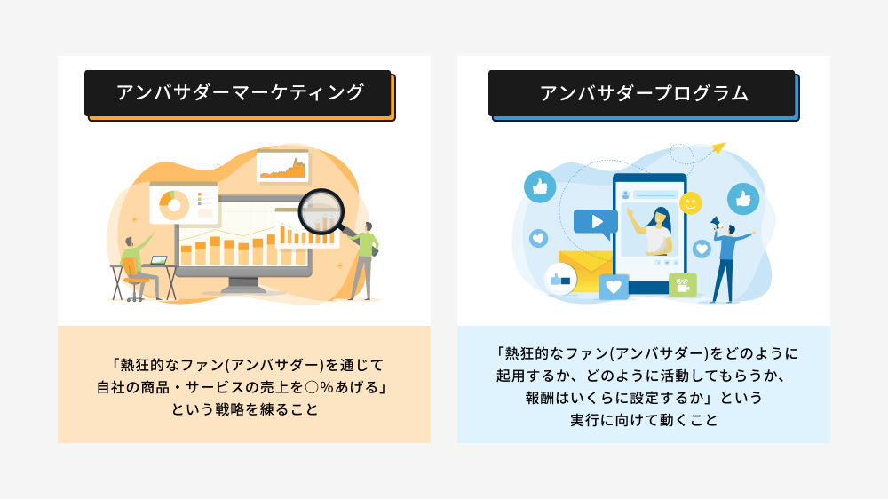 アンバサダーマーケティングと混同されやすい用語の1つに「アンバサダープログラム」があります。アンバサダーマーケティングはアンバサダーを起用したマーケティング戦略全般を指す言葉で、アンバサダープログラムは定めた戦略を実行するための具体的な取り組みを指す言葉です。アンバサダーマーケティングは広義であり、アンバサダープログラムは狭義だと考えると分かりやすいでしょう。