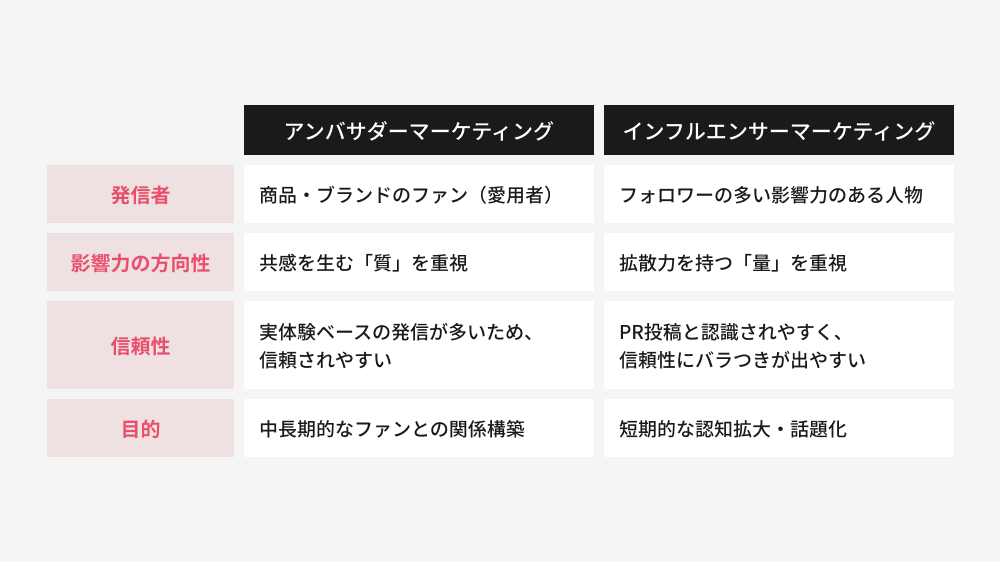 また、アンバサダーマーケティングと似た言葉の1つに「インフルエンサーマーケティング」がありますが、両者は以下の点で異なります。