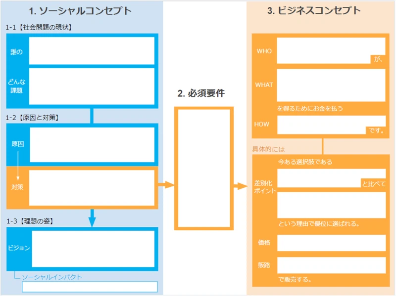 たとえば「貧困層」を例にすると、作物の買取フローにおいて中間マージンを取られすぎていることが生産者の収益減(=現地の貧困)につながっていると判明した場合、ダイレクトトレードでの販売や高単価な作物の生産に注力するなどの対策を定義して「ソーシャルコンセプト」に落とし込みます。そして、その対策に対する制約条件を「必須要件」に記入し、必須要件を網羅できる事業プランを「ビジネスコンセプト」に落とし込みます。