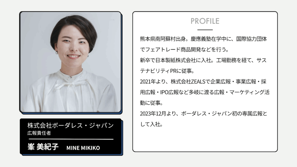 今回は、ソーシャルビジネスを専門に展開する「株式会社ボーダレス・ジャパン」の広報責任者・峯さんにお話を伺いました。