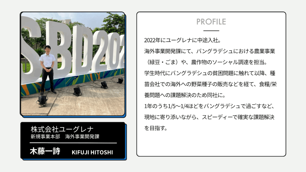 今回は、藻類ユーグレナを活用した製品開発・研究を行う「株式会社ユーグレナ」の海外事業開発課・木藤さんにお話を伺いました。