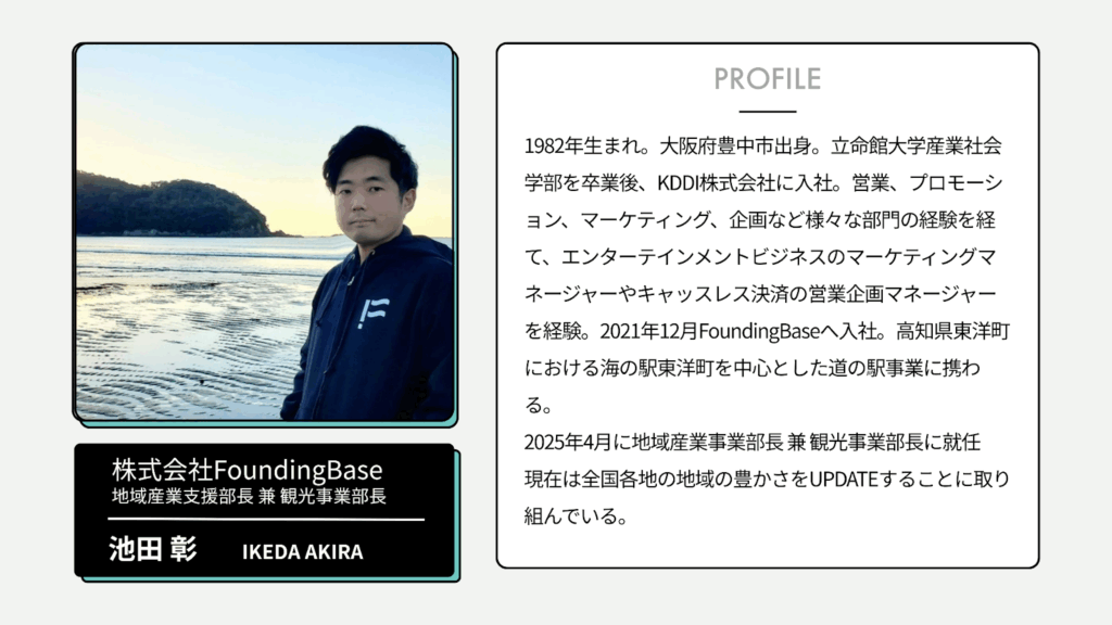 今回は、地域共創の事業を展開する「株式会社FoundingBase」で地域産業支援部長 兼 観光事業部長を務める池田さんに、道の駅事業についてお話しを伺いました。