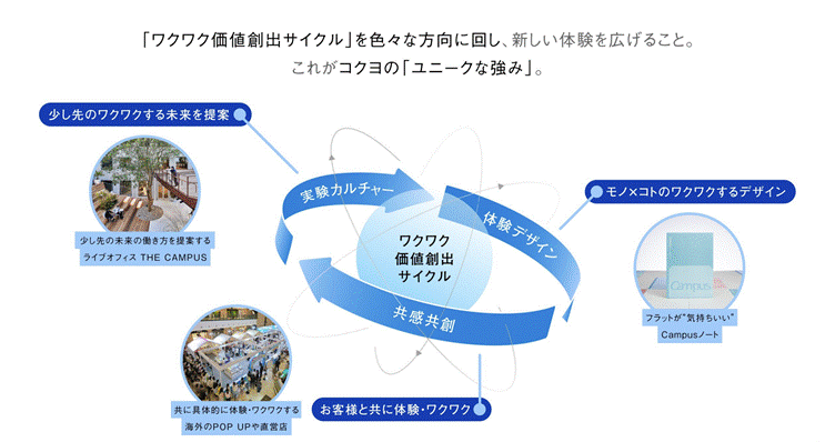 創業者である黒田善太郎の「使う人の立場に立ったものづくり」という精神がすべての原点にあります。その想いを受け継ぎながら、お客さまの課題に共感し、一緒に新しい価値を生み出していく。それが、私たちが大切にしている『共感共創』の考え方です。そして、この理念を具体的に形にしたのが、独自の「ワクワク価値創出サイクル」。この仕組みを軸に、コクヨは“ワクワクする体験価値”を次々と生み出しています。