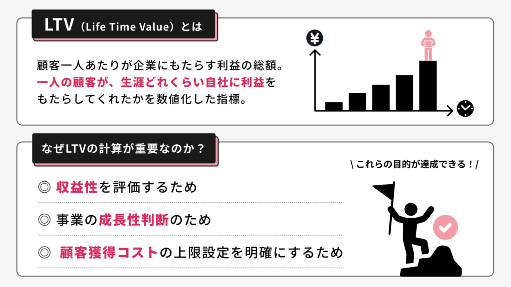 | ● 収益性を評価するため ●事業の成長性判断のため ●顧客獲得コストの上限設定を明確にするため |