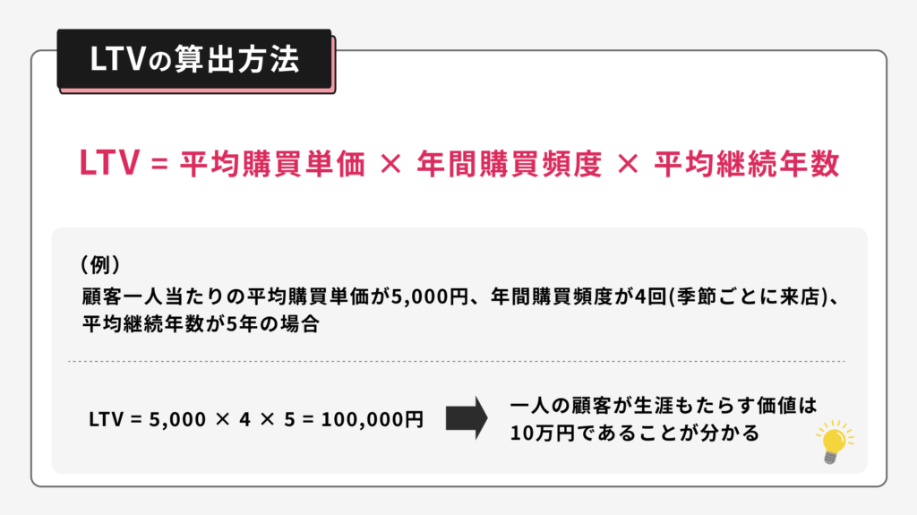 LTV = 平均購買単価 × 年間購買頻度 × 平均継続年数