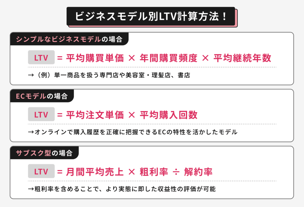 様々な計算方法があるLTVは、ビジネスモデルによって計算式を使い分けることが重要です。ここでは、事業の種類別に適切な計算式や主な活用目的を紹介します。