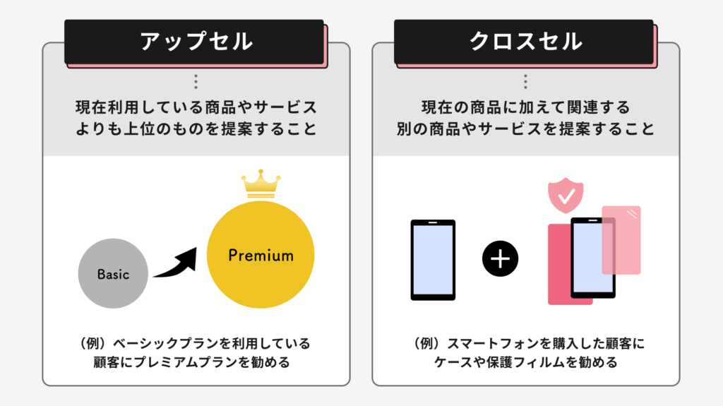 顧客単価をあげる方法としては、アップセルやクロスセルなどがあげられます。これによって、既存顧客により高単価な商品やサービスを提案可能です。