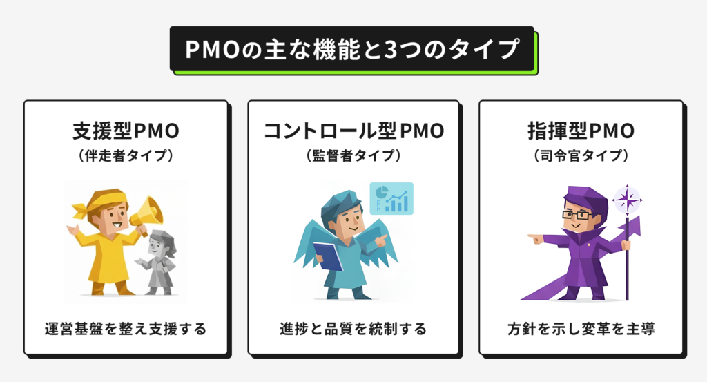 PMOの形は企業によって異なりますが、大きく分けると3つのタイプに分類できます。単に分類を覚えるよりも、“どんな場面で登場するタイプなのか” をイメージできると理解がスムーズになります。