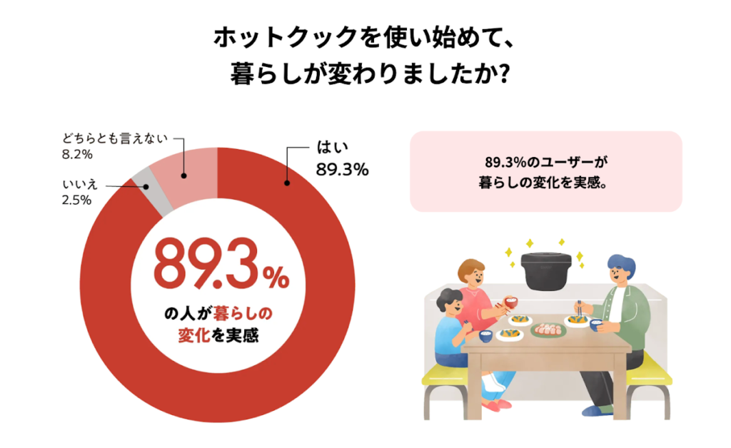 それだけでなく、ホットクックは暮らしにゆとりをもたらす存在でもあります。実際にユーザーの皆さまに「ホットクックを使い始めて暮らしは変わりましたか?」と伺ったところ、約90%の方が「変わった」と回答しているほどです。